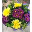 Стандартный (на фото): хризантема одноголовая (желтая) - 3 шт., хризантема зеленая кустовая - 3 шт., хризантема фиолетовая кустовая - 3 шт., солидаго - 2 шт., фетр фиолетовый, крафт, лента. Примерный диаметр букета 30х30 см.
