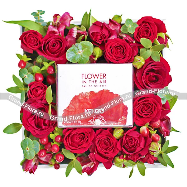 Стандартный: роза красная - 6 шт., роза кустовая красная - 2 шт., альстромерия красная - 1 шт., гиперикум, эвкалипт, парфюм KENZO "Flower in the air 30 ml., оазис, коробка.